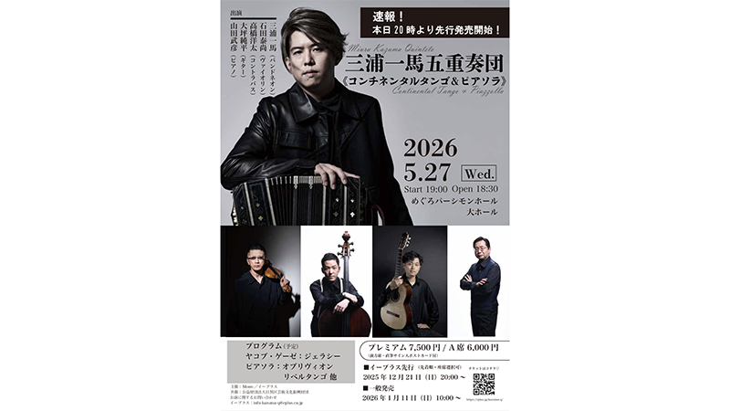 三浦一馬五重奏団<コンチネンタルタンゴ&ピアソラ>プレミアムシート(限定30席)